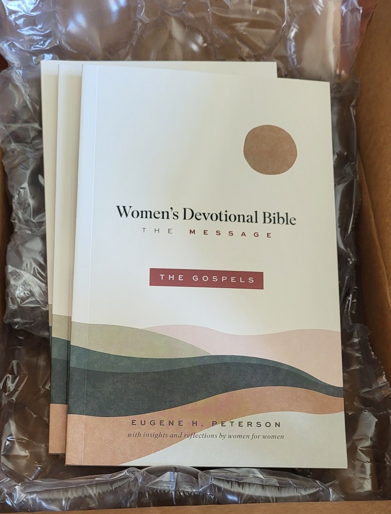 When the doorbell rang, I wasn’t expecting this delightful package! The Message Women’s Devotional Bible will be available August 5th from NavPress, but in the meantime, I have two copies of The Gospels portion to give away.
